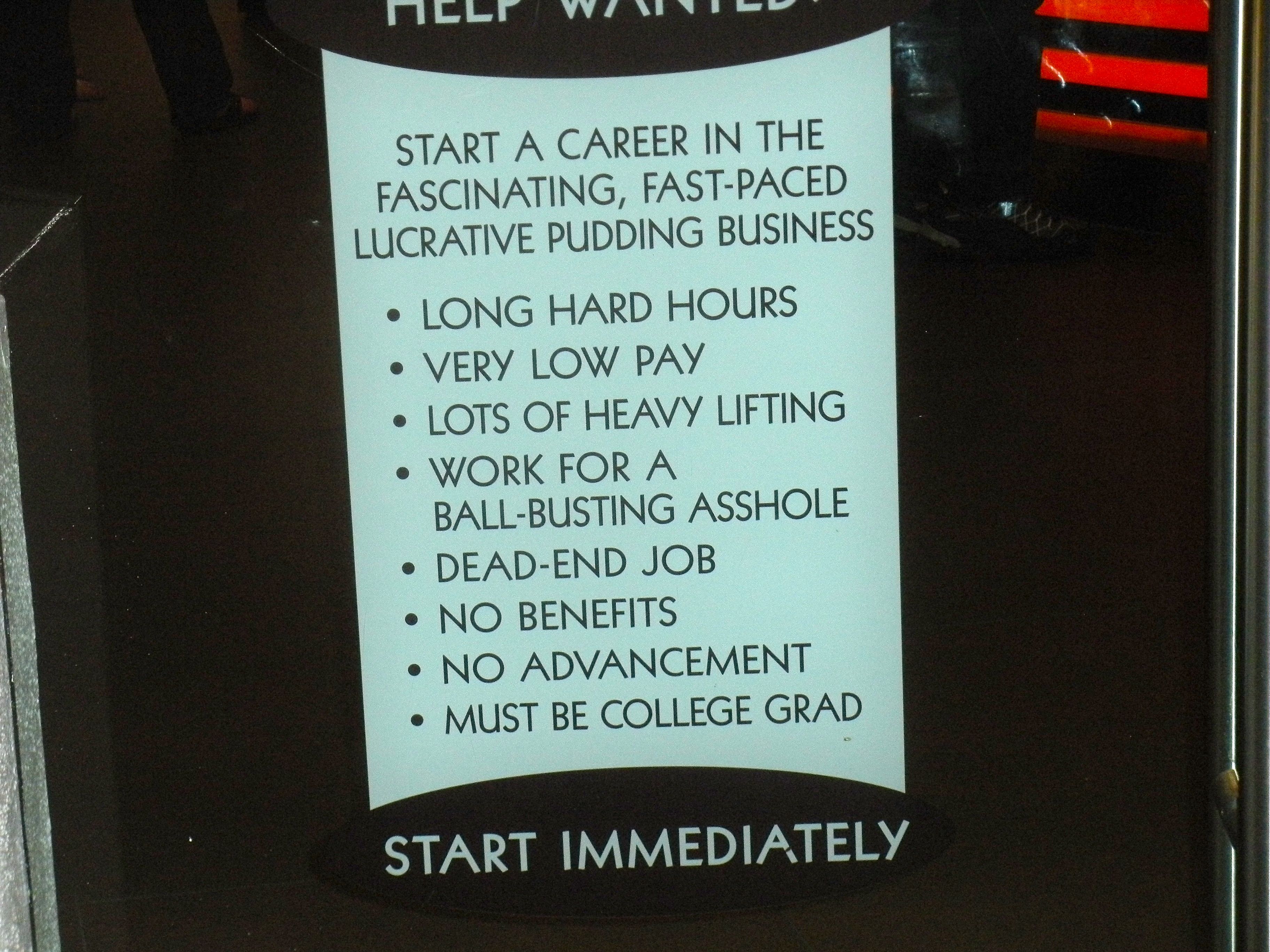 Points for the funniest slash most depressing help wanted sign I’ve ever seen. 😀