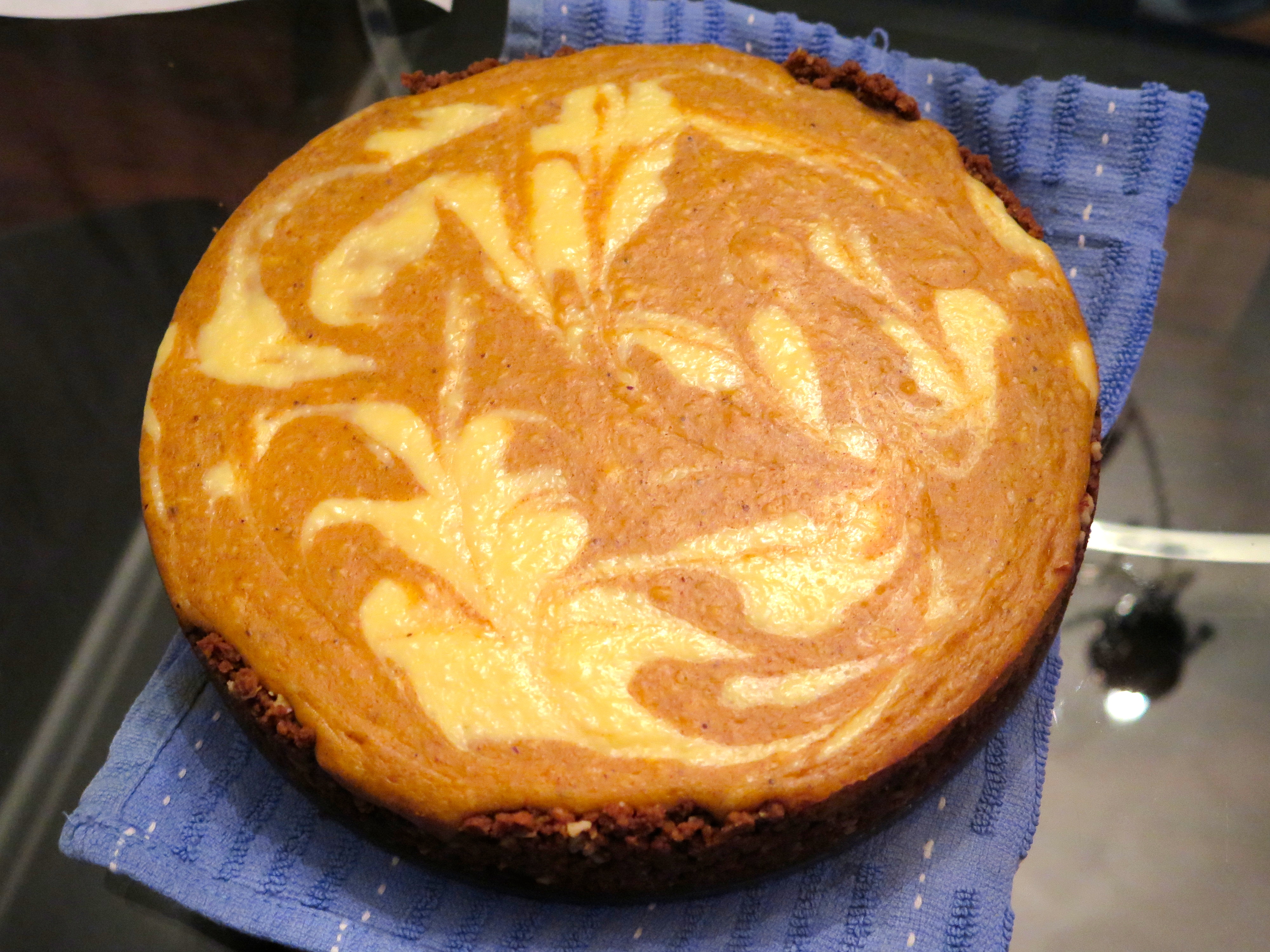 Surprise! About forty minutes in, I went to take a peek at how it was going, and I noticed a small puddle forming on the floor, under the right bottom corner of the oven. I figured someone dropped ice cubes and missed one when cleaning up. Hmm, this water is mighty slippery. You could even say greasy. Turns out there’s a small leak in my springform pan. Not enough to be noticed when I pre-baked the crust for ten minutes, or when I poured the batter in, but just enough for a slow leak of butter from the crust. In the space of the 38 seconds it took for me to notice the puddle and determine that it wasn’t melted ice, the oven, kitchen, and hell, most of the whole apartment filled with smoke. Once the smoke cleared and the danger of fire passed, we stuck the cake in the fridge to chill, hopefully firm in the middle, and generally hope for the best.
